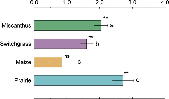 SOC accrual rate (Mg C ha-1 y -1 ) in the top 1m of soil between 2008 and 2016 for maize, miscanthus, switchgrass, and restored prairie. Bars = mean (n=5). Error bars = standard error of the mean. **p ≤ 0.05, ns=not significant.
