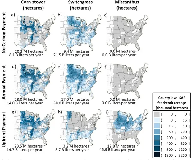 Spatial biomass production and SAF estimates by feedstock across different carbon payment scenarios.