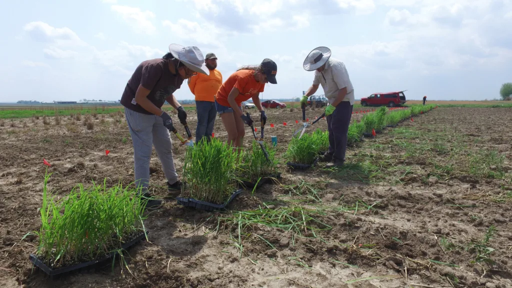 Erik Sacks, right, and his team trim miscanthus starts at the Illinois Energy Farm. Credit: CABBI
